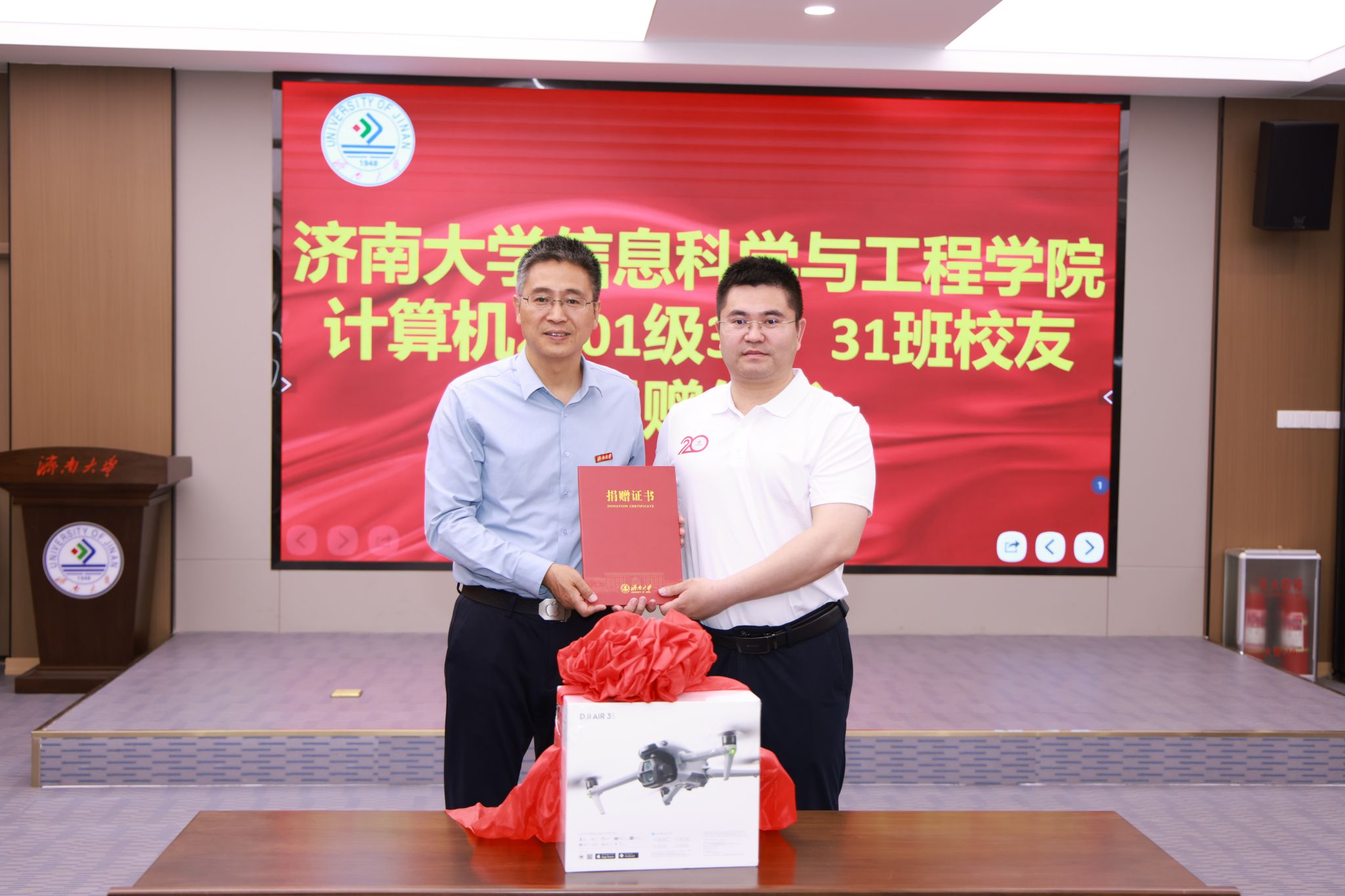 此外,校友们还向学校捐赠无人机一架,表达了对母校的感恩之情和对学弟学妹们的殷切期望。这份特殊的礼物不仅是校友们对母校的深情回馈,更是他们对信息学院未来发展的美好祝愿。夏卫东代表学院接受捐赠并向校友代表发放了捐赠证书。