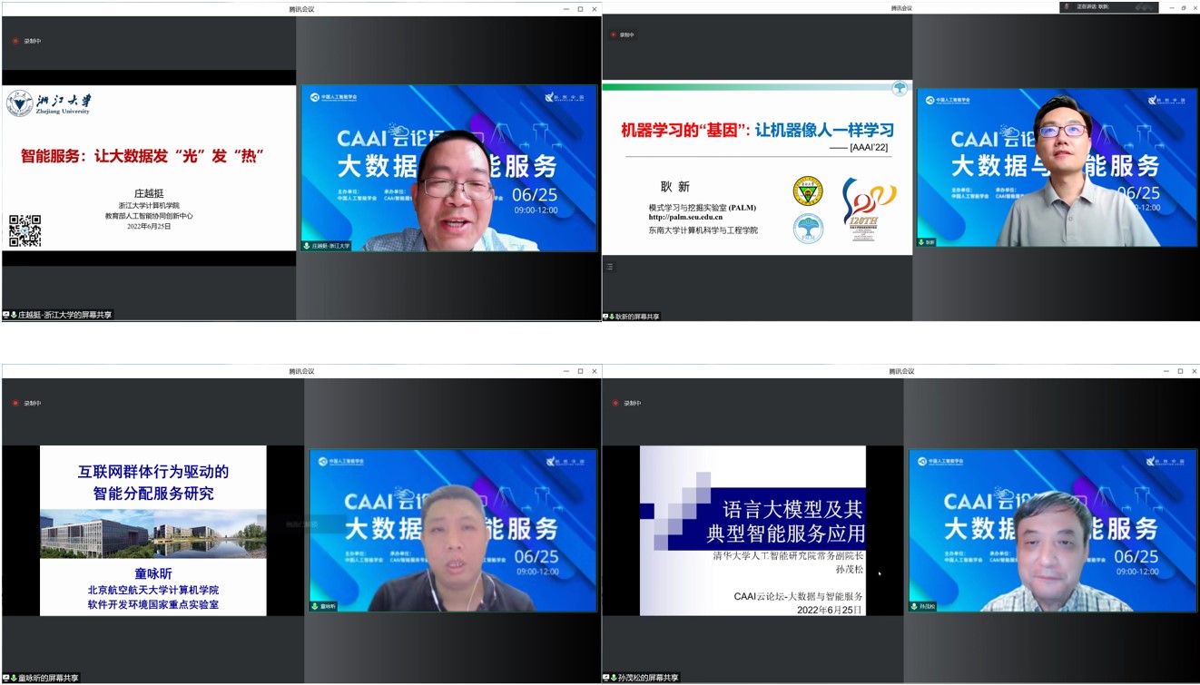 庄越挺教授首先做了“智能服务:让大数据发‘光’发‘热’”的主题报告,对大数据、知识表达及知识获取等基本问题进行了再认识和思考,探讨当前的研究趋势,并介绍了目前从事的可泛化的知识计算引擎等智能服务与技术,以及大数据智能在数字城市治理、产业链预警和精准招商等数字经济领域的应用;随后,耿新教授做了题为 “机器学习的‘基因’:让机器像人一样学习”的报告,介绍了其研究团队提出的基于Learngene的全新学习框架;接下来,童咏昕教授报告的主题是“互联网群体行为驱动的智能分配服务研究”,结合群智动态分配研究的背景与特点,介绍了互联网群体行为驱动的智能分配框架;最后,孙茂松教授以“语言大模型及其典型智能服务应用”为题,阐述了语言大模型的特点及其作为智能信息处理“软”基础设施的重要地位,通过若干典型案例,评价并讨论了在其支撑下可赋能的典型智能服务新应用。
