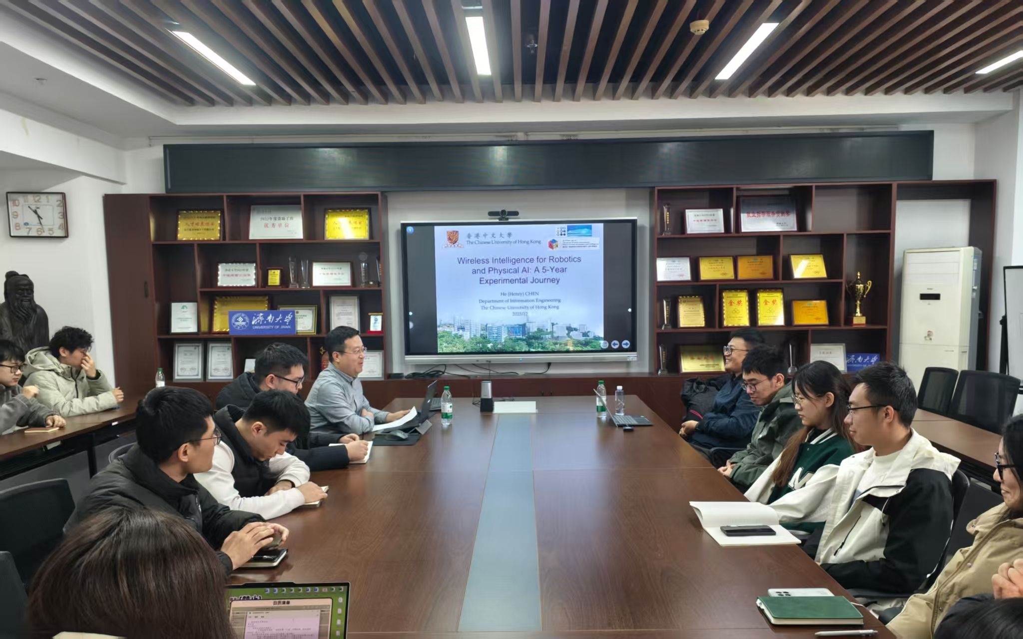 报告会上,陈赫教授分享了团队近五年在无线智能方向的研究历程以及所取得的成果,重点介绍了提升移动机器人无线连接能力、视觉语言模型与机器人的融合,以及在养老护理等民生场景的落地规划。随后,在讨论环节,围绕科学研究、人才培养等问题展开深入交流,陈赫教授针对技术应用场景、大模型落地、具身智能未来研究热点等问题,与参会教师和同学进行了探讨。